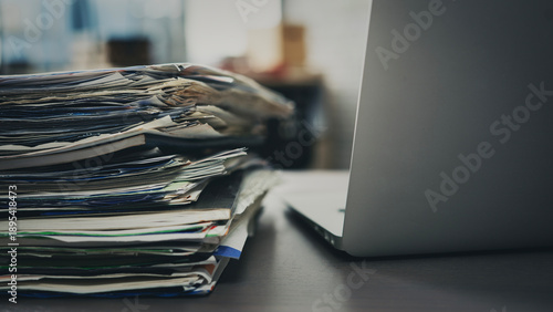 © sebra, Fototapeta premium A pile of papers next to the laptop