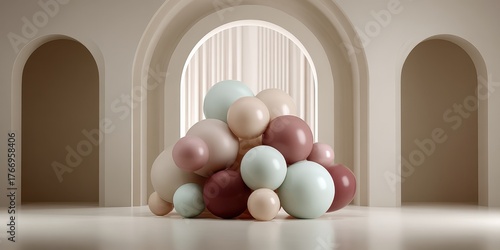 © sawaratch, Fototapeta premium A pile of pastel colored spheres stacked in front of arched doorways and soft drapes