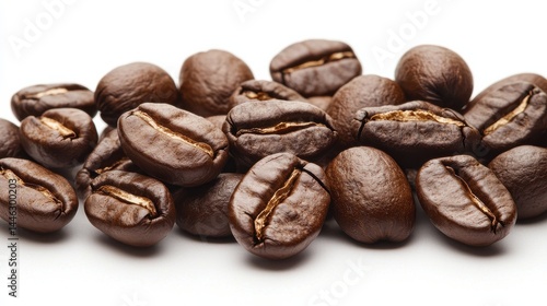 © Noppakun, Naklejka premium A pile of roasted coffee beans on a white background, showing their rich brown color and smooth, glossy texture.