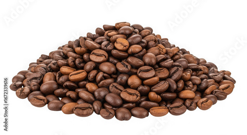 © MDARMAN, Naklejka premium A pile of roasted coffee beans with a dark brown color and visible cracks on a black background isolated on a transparent background