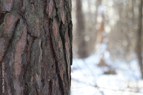 Fototapeta premium A pine trunk and a blurred background behind it. Winter