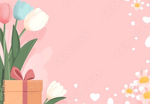 © Tanish, Naklejka premium A pink background with tulips and gift boxes