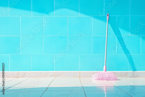 Obraz premium A pink broom stands on a shiny tiled floor against a bright blue wall in a...