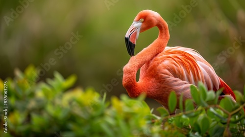 © Viktor, Fototapeta premium A pink flamingo in a bush, head askew, beak agape