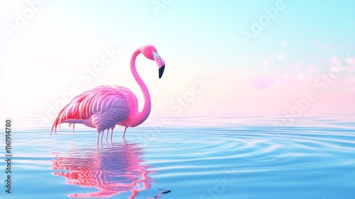 © Korawan, Naklejka premium A pink flamingo is standing in the water
