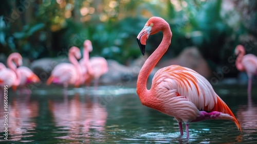 © Dara, Fototapeta premium A pink flamingo standing in a pond with other flamingos in the background.