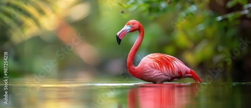 Fototapeta premium A pink flamingo wades in a body of water, with its head submerged and...