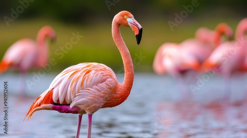 © Mikus, Fototapeta premium A pink flamingo wades in the water amidst background flamingos, while a green field lies in the distance