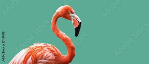 Obraz premium A pink flamingo with an elegant neck and striking beak, standing in water, showcasing its beauty and grace in a tropical wildlife setting