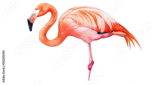 © B 7 YOU, Obraz premium A pink flamingo with long, elegant legs and a curved neck stands on one leg, isolated on a white background.