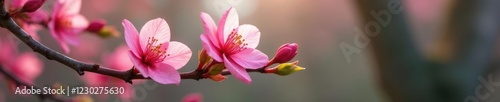 Fototapeta premium A pink flower blooms in the crook of a tree's branch, isolated, blooming...