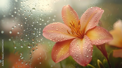 © Igor, Fototapeta premium A pink flower rests atop a window, surrounded by a drizzly ledge