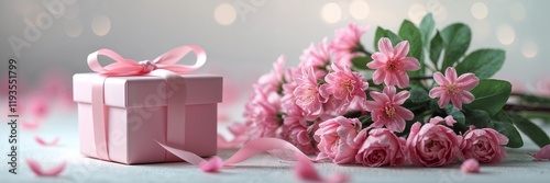 Fototapeta premium A pink gift box with a ribbon beside a pink flower arrangement.