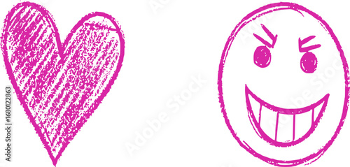 Obraz premium A pink heart and a smiling face with evil eyes, hand-drawn and scribbled on...