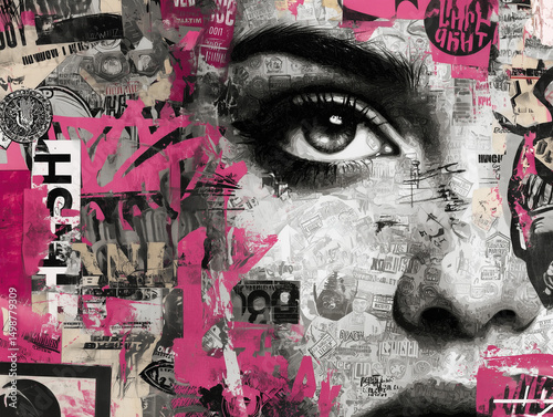 Naklejka premium A pink muted chaotic, graffiti collage with a woman face