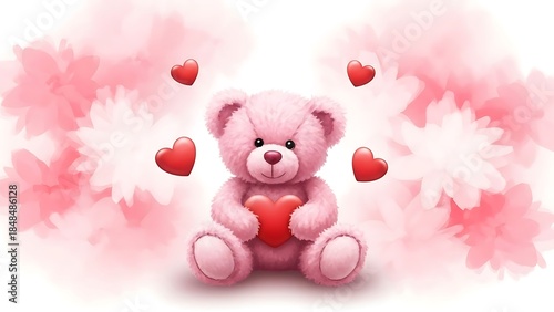 © RitaRuhi, Obraz premium A pink teddy bear holding a heart with hearts and pink clouds