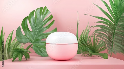 Fototapeta premium A pink-themed cosmetic container is elegantly set against lush green leaves,...