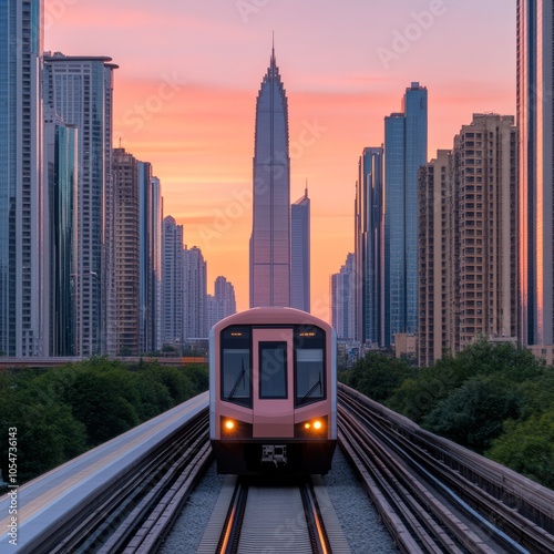 © MetaKibo, Naklejka premium A pink train approaches a modern skyline during sunset.