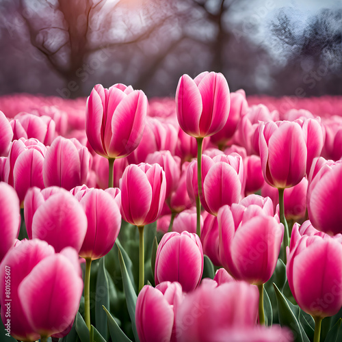 Fototapeta premium A pink tulip flower garden blooming in the sunset field