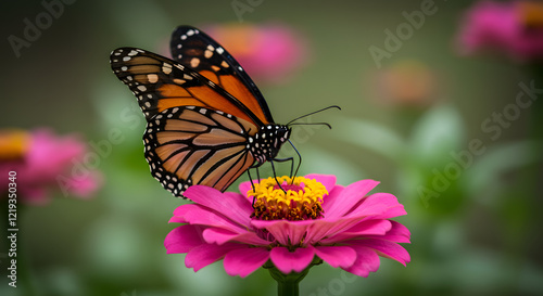© Vanier Johanne, Obraz premium A pink zinnia flower hosts a monarch butterfly as it feeds.
