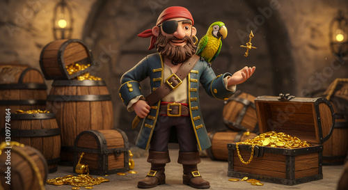 © LarisaM, Naklejka premium A pirate is holding a parrot and standing in front of a pile of gold. The scene is set in a room with wooden crates and barrels, giving it a rustic and adventurous feel