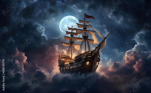 Fototapeta premium A pirate ship flying through the clouds in the night sky.