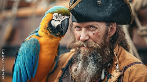 © Galib, Fototapeta premium A pirate wearing a hat and looking at the camera, with a blue and yellow macaw parrot on his shoulder.
