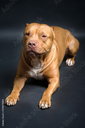 © Mariana, Fototapeta premium A pit bull on a black background. Dog portrait