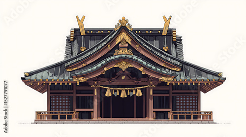 Fototapeta premium A pixel-art depiction of a traditional Japanese shrine, featuring a multi-tiered dark roof with gold accents and a simple, elegant structure.