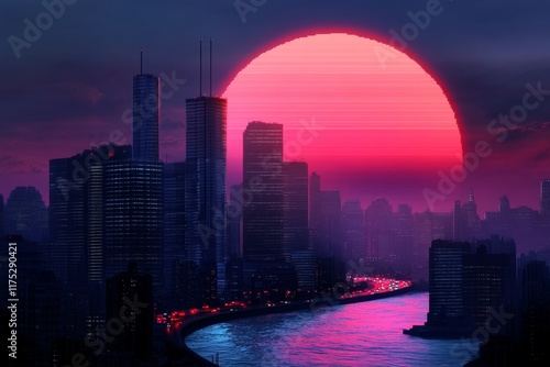 © Thammarong, Obraz premium A pixel art highway scene with blocky cars and vibrant sunset hues, evoking a retro game aesthetic