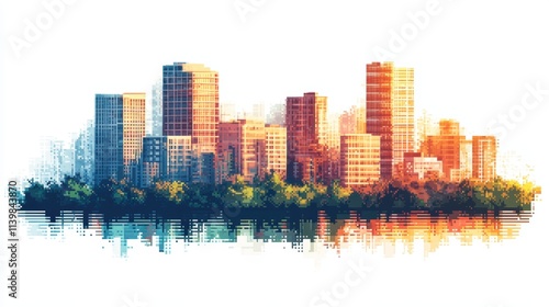 © Rashedul, Obraz premium A pixel art real estate building skyscraper, on a solid white background