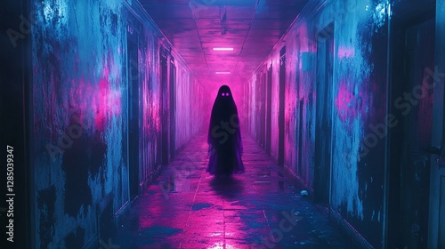 © Kanok, Fototapeta premium A pixel ghost floating through neon-lit haunted corridors