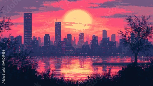 © DudeDesignStudio, Fototapeta premium A pixelated cityscape silhouette at sunset with a large orange sun reflecting in the water.