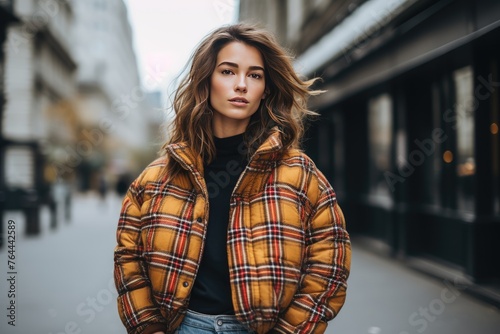 © OhmArt, Fototapeta premium A plaid puffer jacket worn over a sweater and jeans for a cozy and on-trend winter look. Woman fashion christmas.