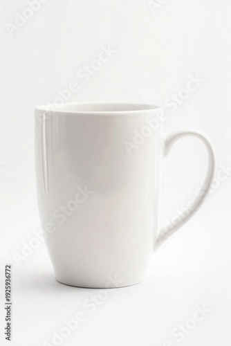 Obraz premium A plain ceramic mug tilted slightly on solid white background, glaze...