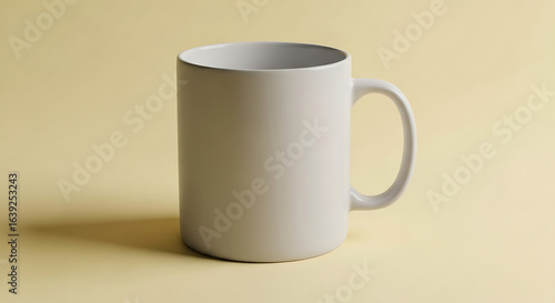 © Ozi, Obraz premium A plain, empty, ceramic mug with a handle sits on a light yellow background, casting a shadow.