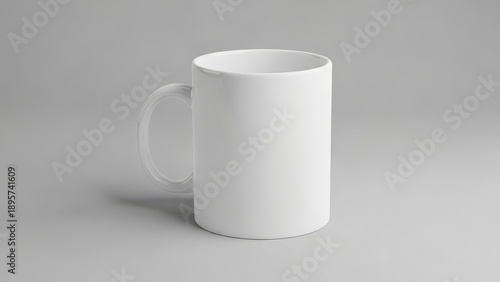 Obraz premium A plain white ceramic mug sits on a plain grey surface, casting a soft shadow.