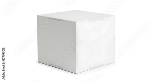 Fototapeta premium A plain white cube with subtle horizontal lines on its edges sits on a white...