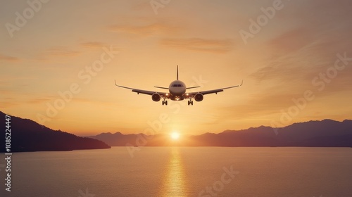 © KayKai, Fototapeta premium A plane is flying over a body of water at sunset