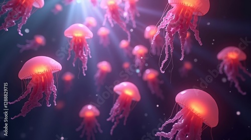 Naklejka premium A planet of floating, jellyfish-like lifeforms drifting through a thick, glowing atmosphere, their translucent bodies pulsating with soft neon light.