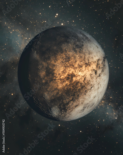 Fototapeta premium A planet with dark gray and light brown colors, a starry sky background, photorealistic in style