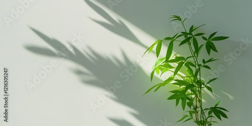 Naklejka premium A plant with leaves is in front of a wall. The leaves are green and the plant...