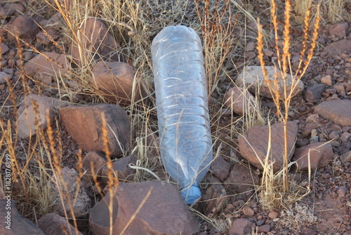 Obraz premium A plastic bottle lying on the ground, Plastic pollution, Plastic environmental impact