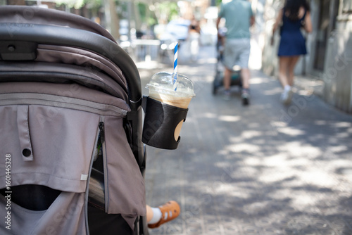 Obraz premium A plastic cup with iced coffee and a striped straw is placed in a cup holder attached to a baby stroller. The scene is on a sunny day in a city, with people walking in the background.