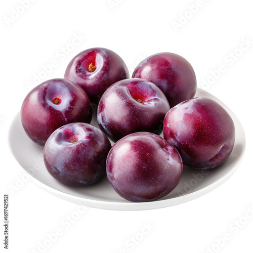 © An, Obraz premium A plate of plums, fresh and perfect for snacking. full length isolate on transparent background