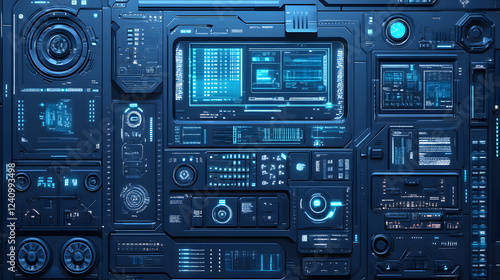 Fototapeta premium A platinum blue design featuring a combination of glowing grids and digital interfaces, ideal for tech-inspired art.