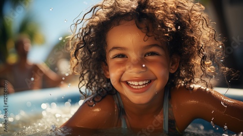 © Muzamil, Obraz premium A playful African girl glides down a slide into a bright water park pool, laughing with joy.