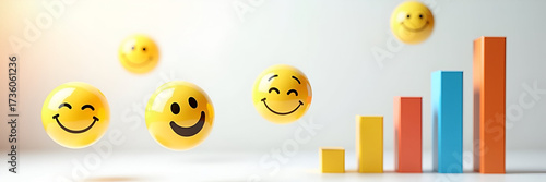 Fototapeta premium A playful arrangement of floating smiley faces alongside satisfaction graphs, beautifully rendering customer satisfaction metrics with ample space for informative content.