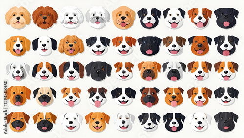 © Amiir, Obraz premium A playful assortment of cartoon dog portraits in vector format. Showcasing a variety of breeds with distinct expressions, cute muzzles, and friendly pet profile icons. Ideal for stickers, logos, and d