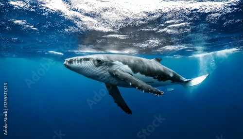 © saif, Naklejka premium A playful baby humpback whale gracefully arches near the ocean’s surface, creating ripples in the shimmering blue water